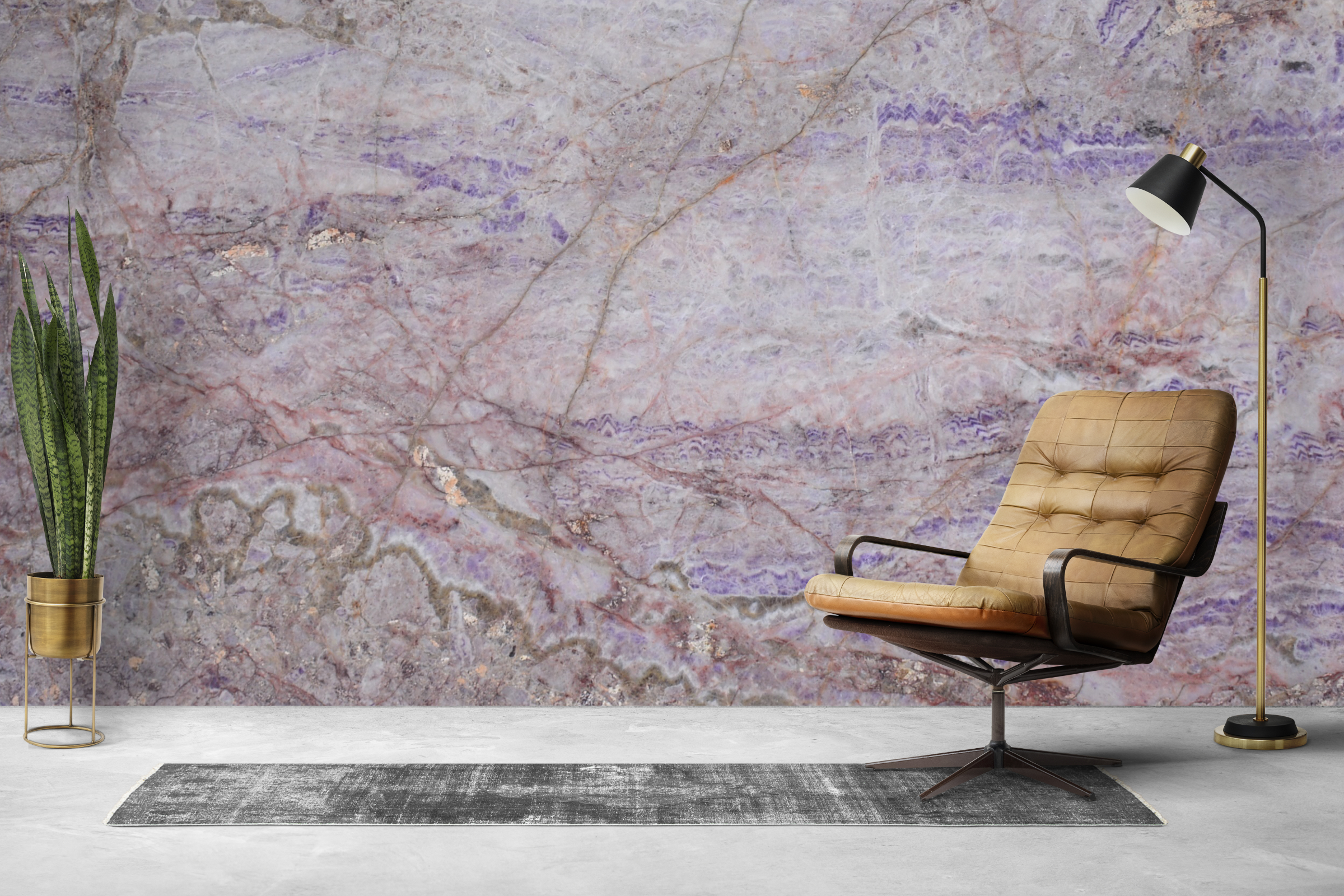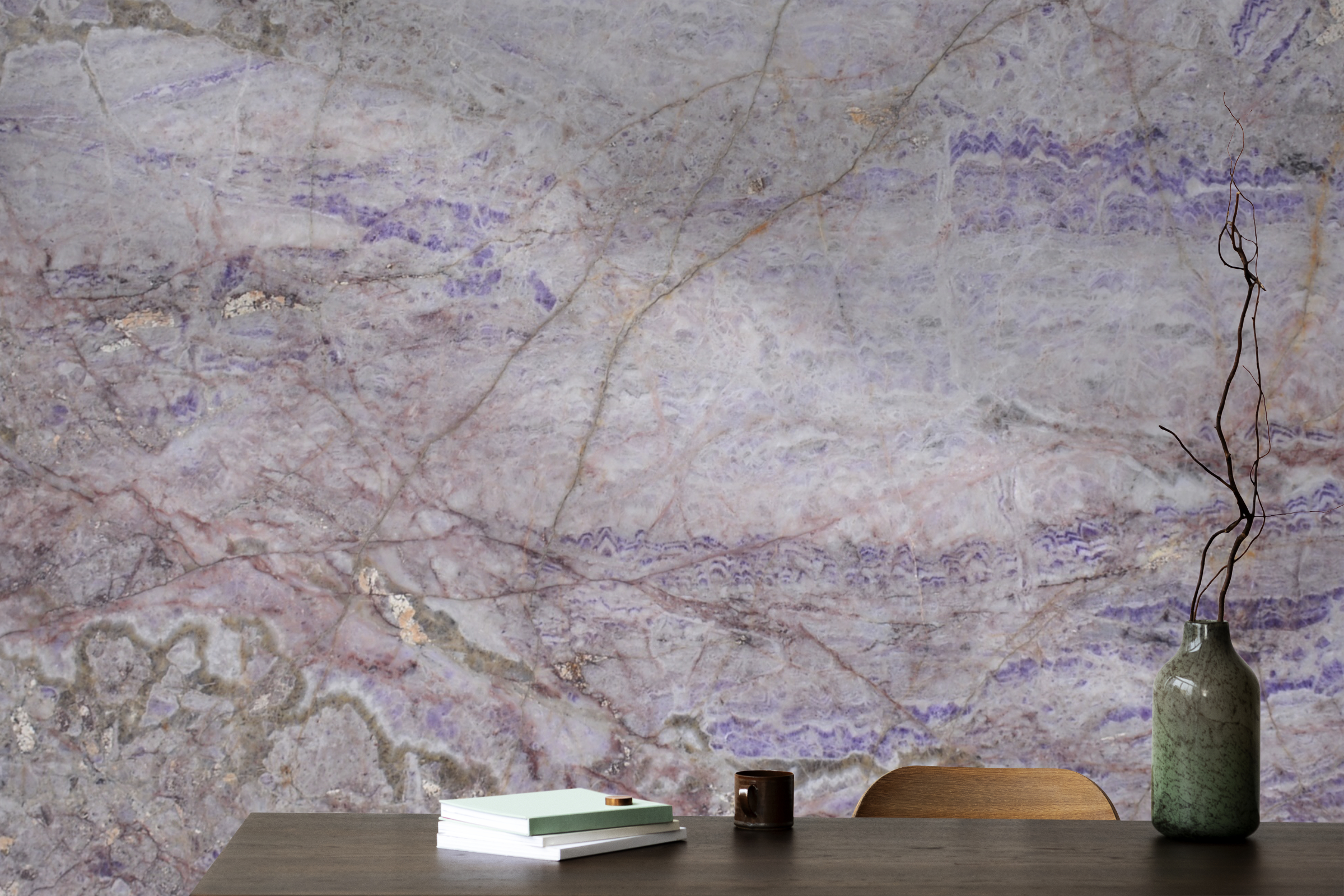 Amethyst delivers a striking, elegant look with its soft light-purple base and its bold mix of dark purple and warm brown veining. The stone immediately transforms any space and introduces a unique, luxurious color palette you rarely see in natural stone. Its pastel-violet background sets a refined and artistic foundation for high-end design.