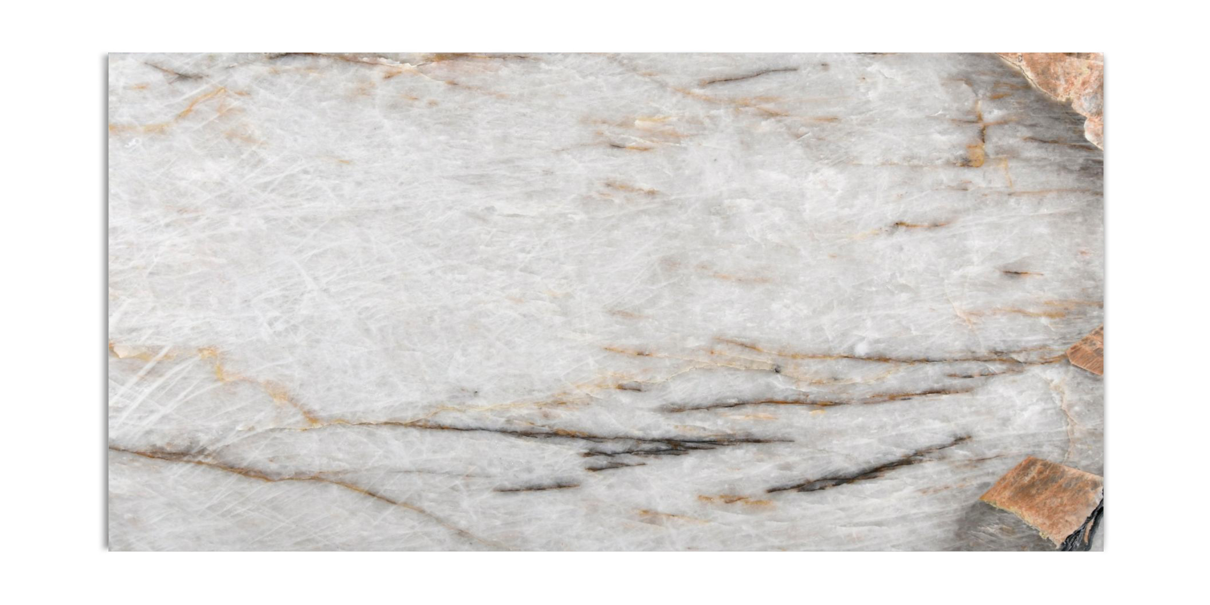 Bold black veins cut across the quartzite and create strong definition and movement. Warm brown accents weave between the darker lines and introduce an earthy richness that balances the high-contrast palette. These colors work together and form a dynamic, expressive pattern that elevates the entire design.