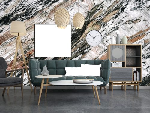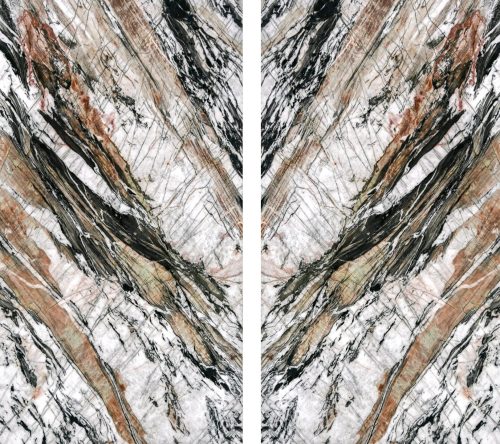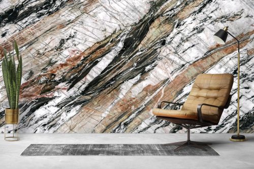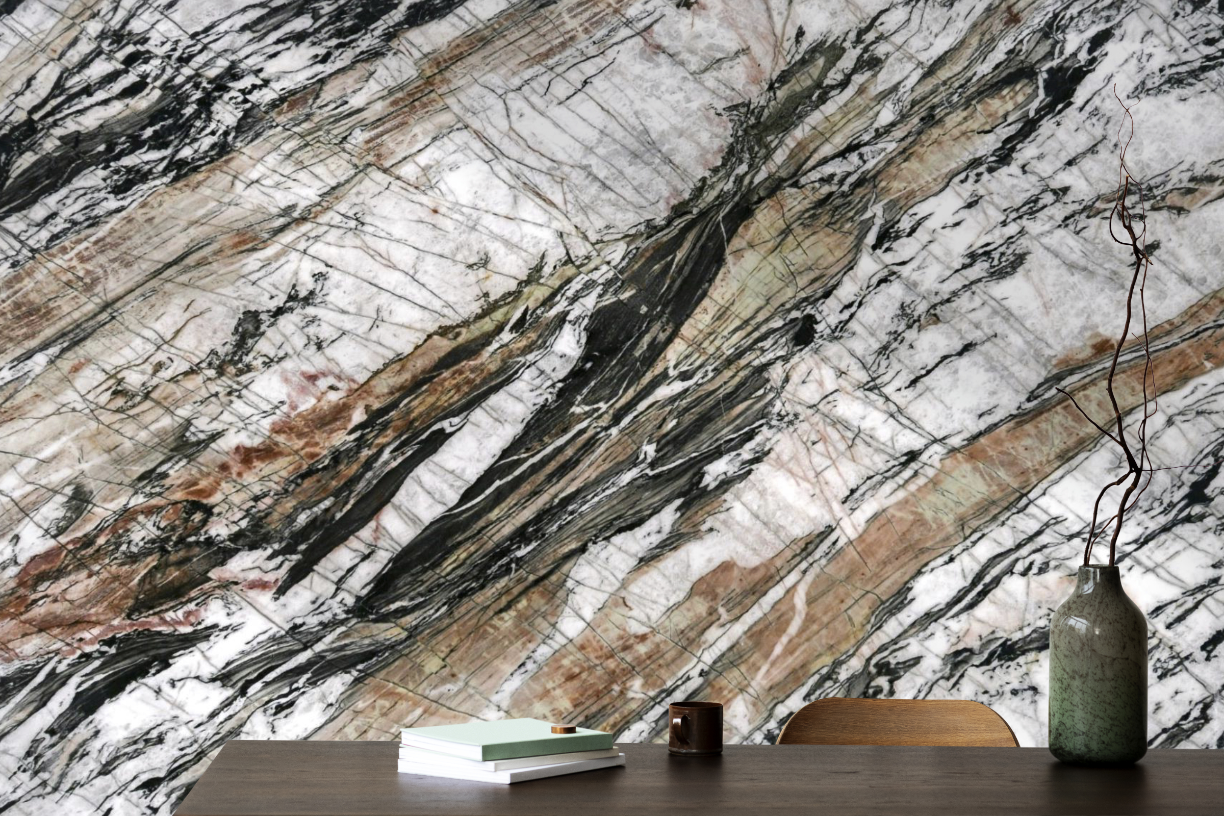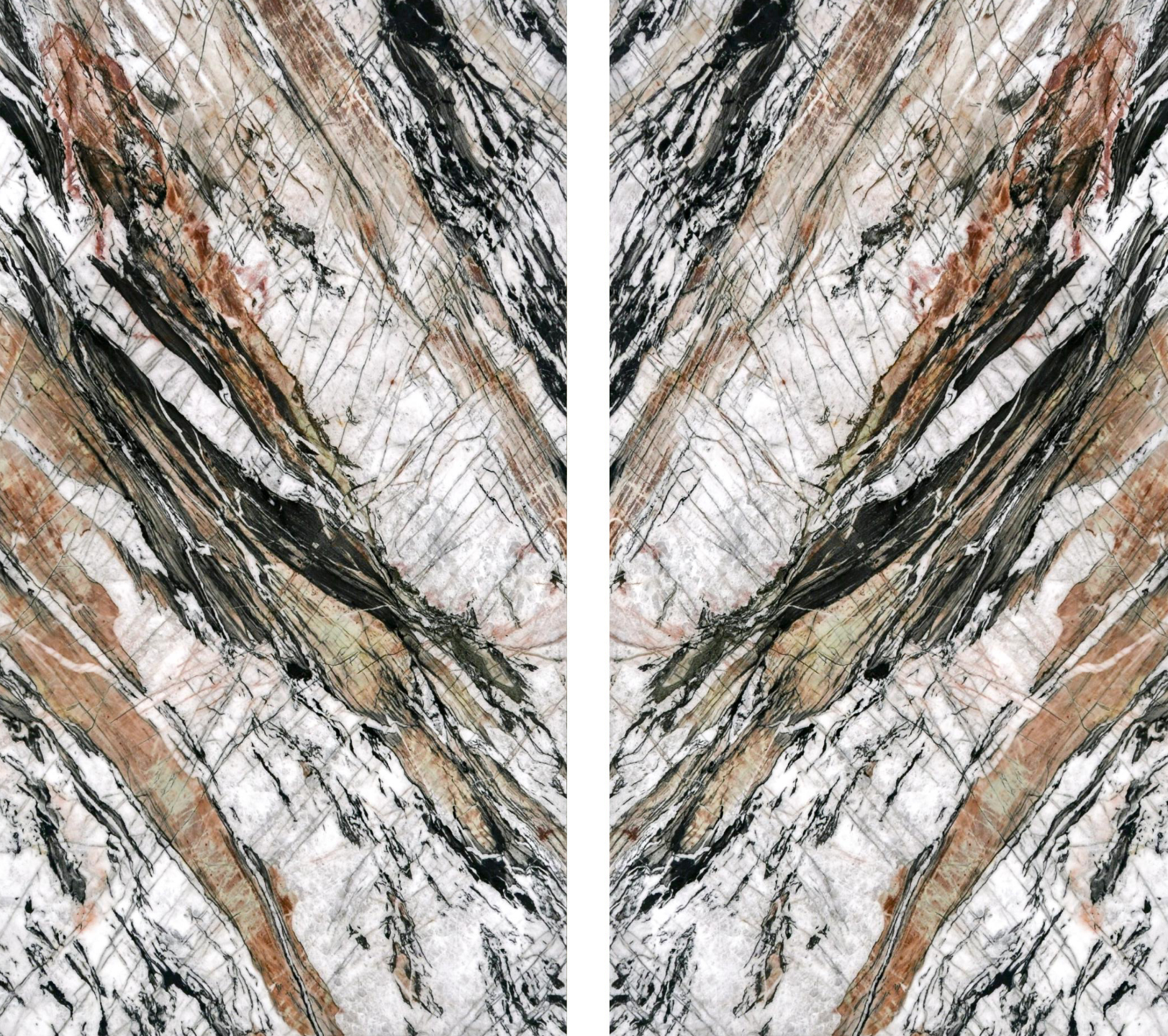 Black and charcoal lines sweep boldly across the slab and create strong definition. Grey accents add depth and movement. Warm brown tones introduce an earthy balance that grounds the entire pattern. These colors work together and form a cohesive, expressive surface that draws the eye and elevates the room.