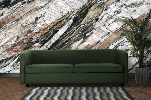 It pairs effortlessly with many finishes. It enhances white and natural wood cabinetry, strengthens matte black hardware, complements brushed nickel and brass, and blends seamlessly with both warm and cool color schemes. Whether you design a modern kitchen, a luxurious bathroom, or a detailed transitional space, this quartzite elevates the entire layout.