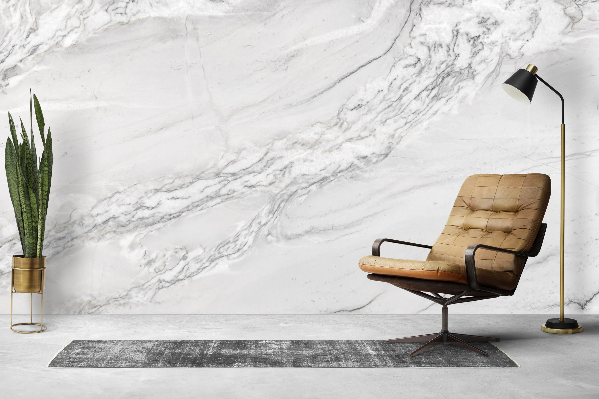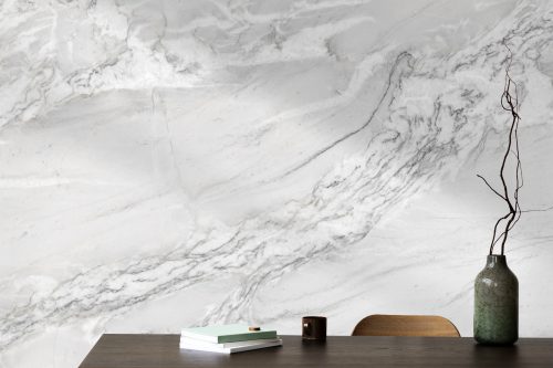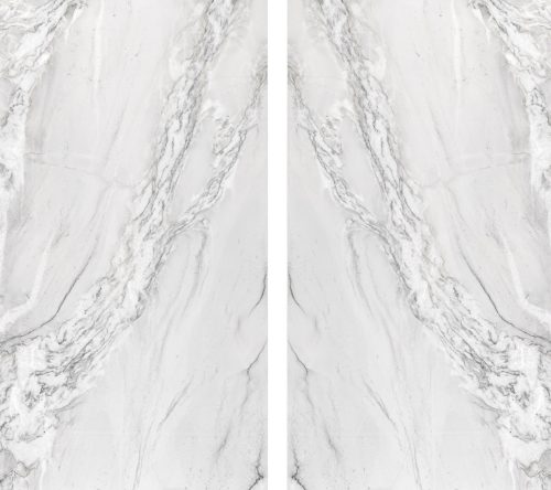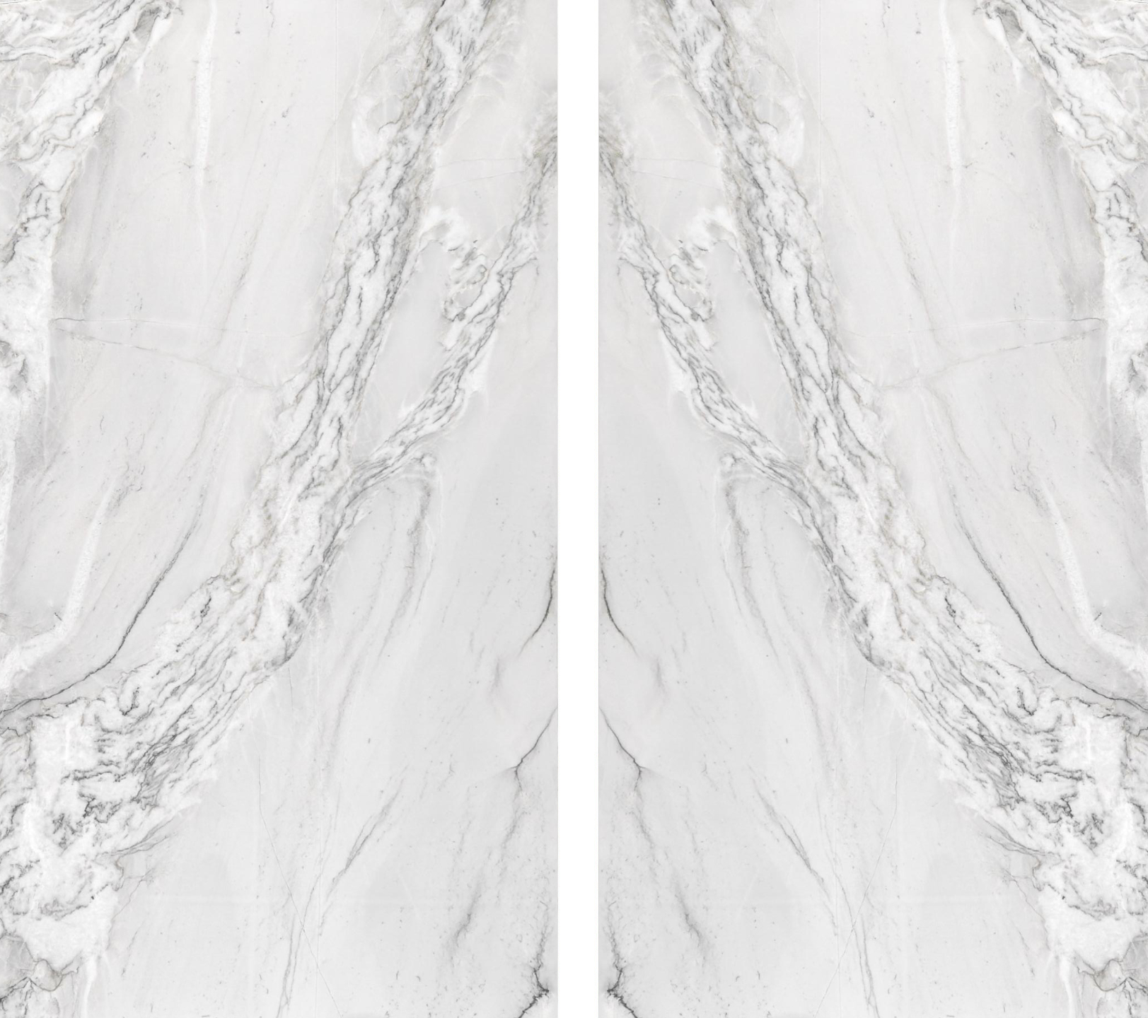 Black veins sweep across the slab in striking, natural patterns and create powerful contrast against the white background. These bold lines add movement, depth, and visual structure. Subtle transitions of grey and off-white surround the veining and enrich the stone’s overall texture, giving it a sophisticated, layered appearance.