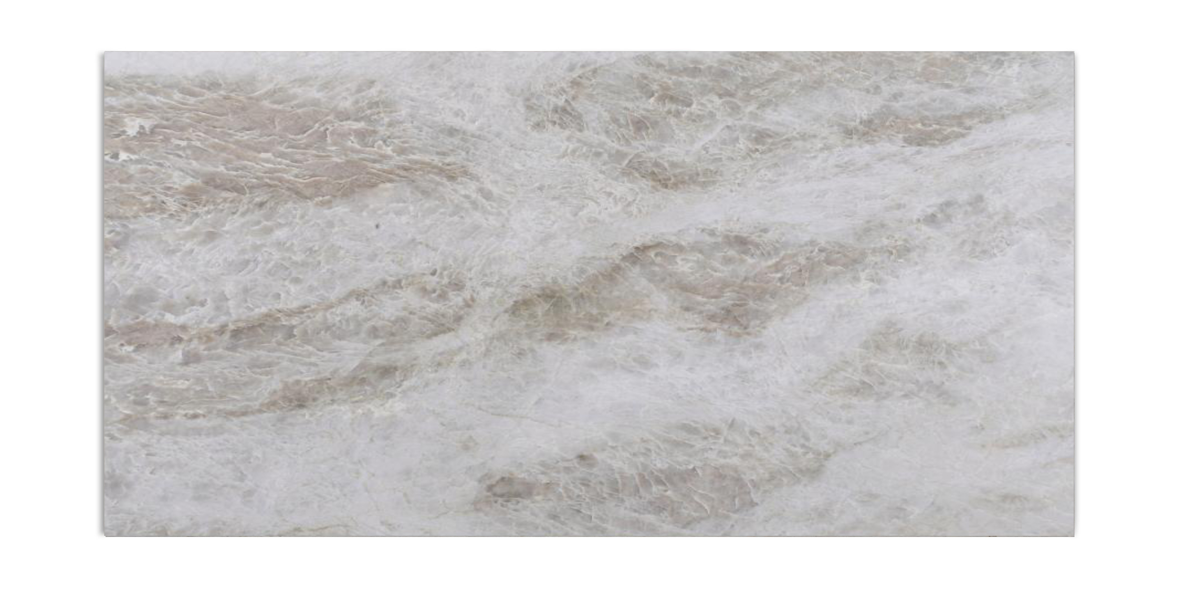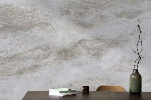Warm brown veins move across the surface in smooth, natural patterns and add depth, contrast, and character. These expressive lines highlight the quartzite’s organic beauty and give the slab a subtle yet captivating presence. Light variations of cream, beige, and warm taupe blend seamlessly with the veining and enhance the stone’s harmonious look.