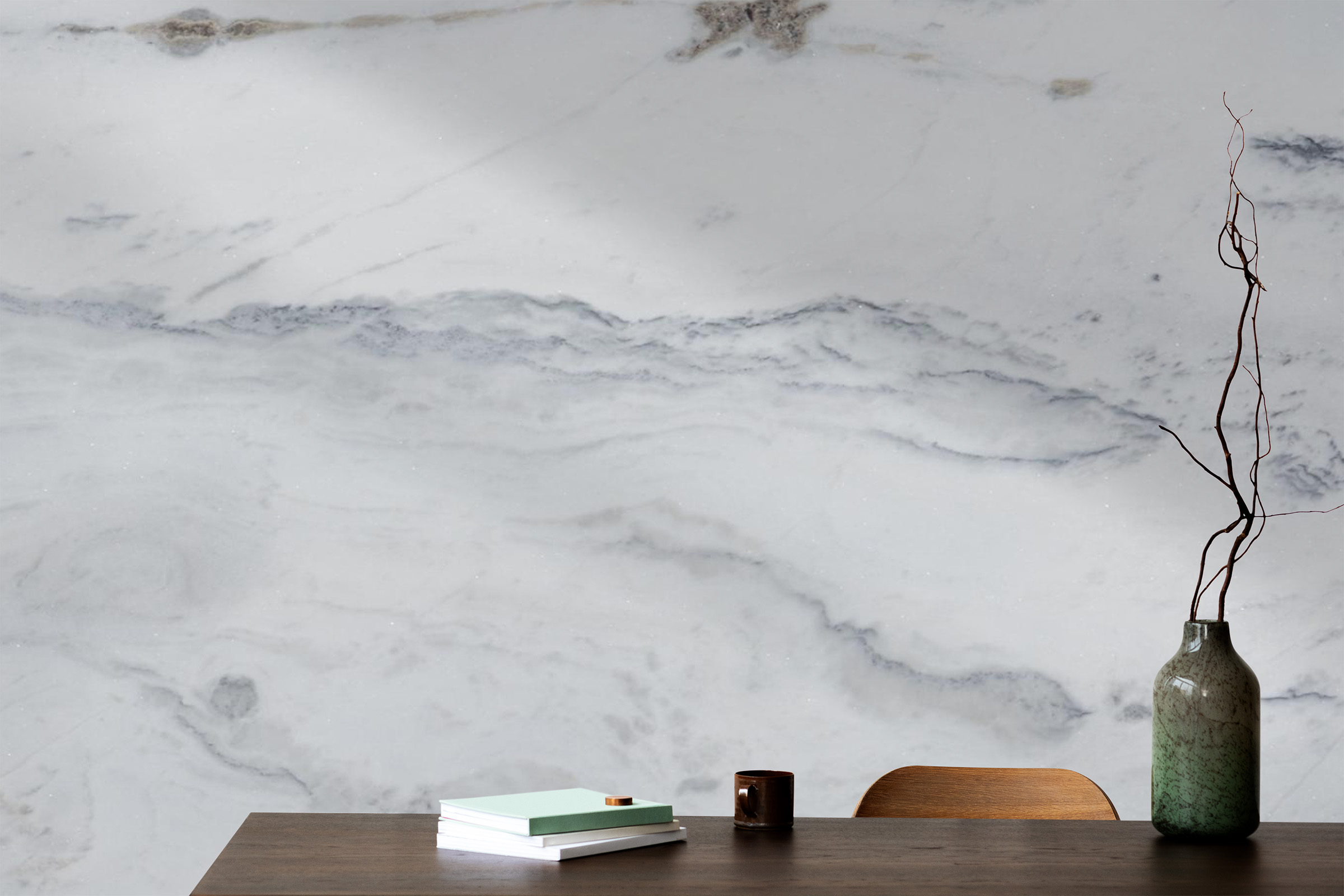Flowing across the surface are refined white and light-cream veins, layered in organic, almost watercolor-like patterns. These veins create delicate movement throughout the slab, adding visual depth without overwhelming the stone’s serene presence. Subtle hints of charcoal or darker green veining may appear in select portions, giving contrast and enhancing the marble’s natural artistry.